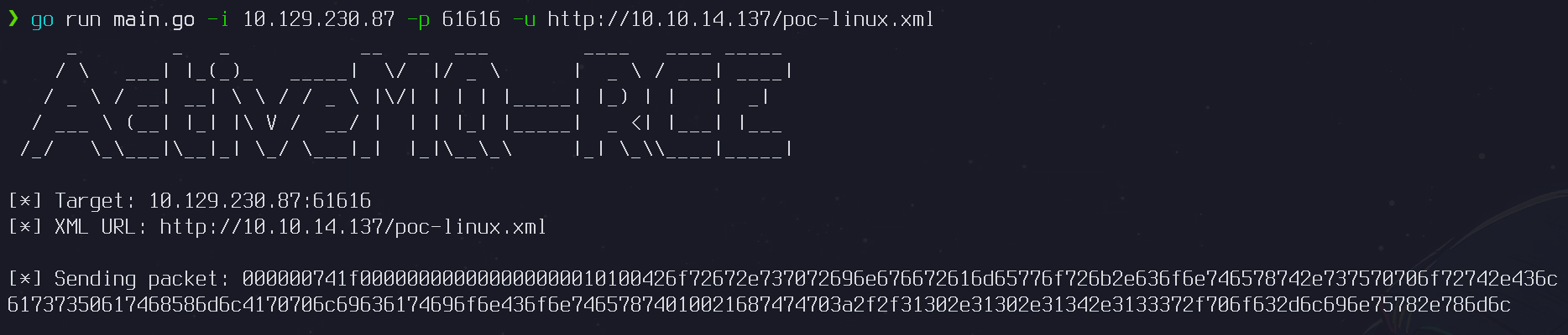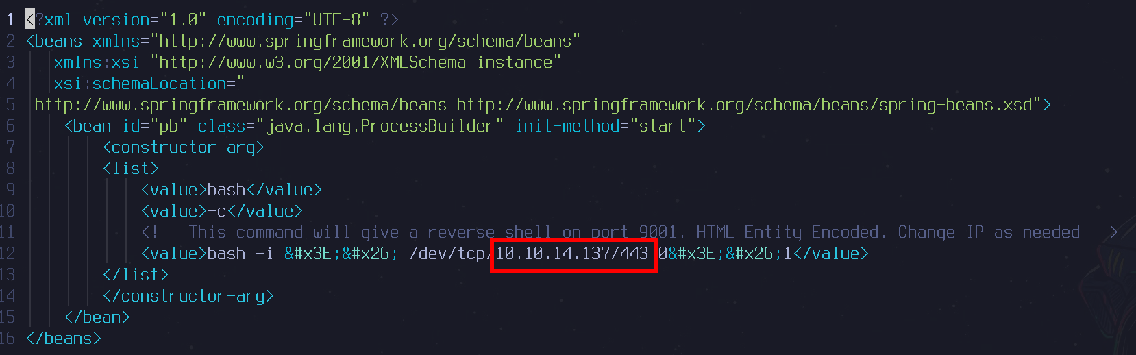En el repositorio de github, podemos encontrar una manera de explotar la vulnerabilidad para ejecutar comandos en la máquina víctima y obtener una reverse shell. Cambiamos en el archivo poc-linux.xml la dirección IP y el puerto para que coincida con nuestra IP de atacante y el puerto en el que nos vamos a poner a la escucha para recibir la reverse shell.