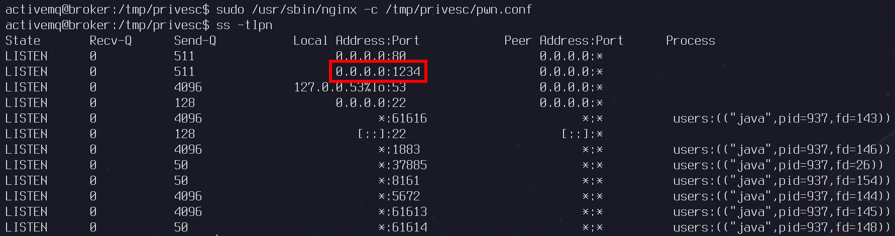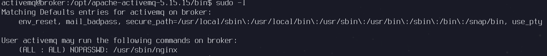 Broker es una máquina Linux que aloja una versión de Apache ActiveMQ. La enumeración de la versión de Apache ActiveMQ muestra que es vulnerable a Unauthenticated Remote Code Execution, que se aprovecha para obtener acceso de usuario en el objetivo. La enumeración posterior a la explotación revela que el sistema tiene una configuración incorrecta de sudo que permite al usuario activemq ejecutar sudo /usr/sbin/nginx, que es similar a la reciente divulgación de Zimbra y se aprovecha para obtener acceso root.
